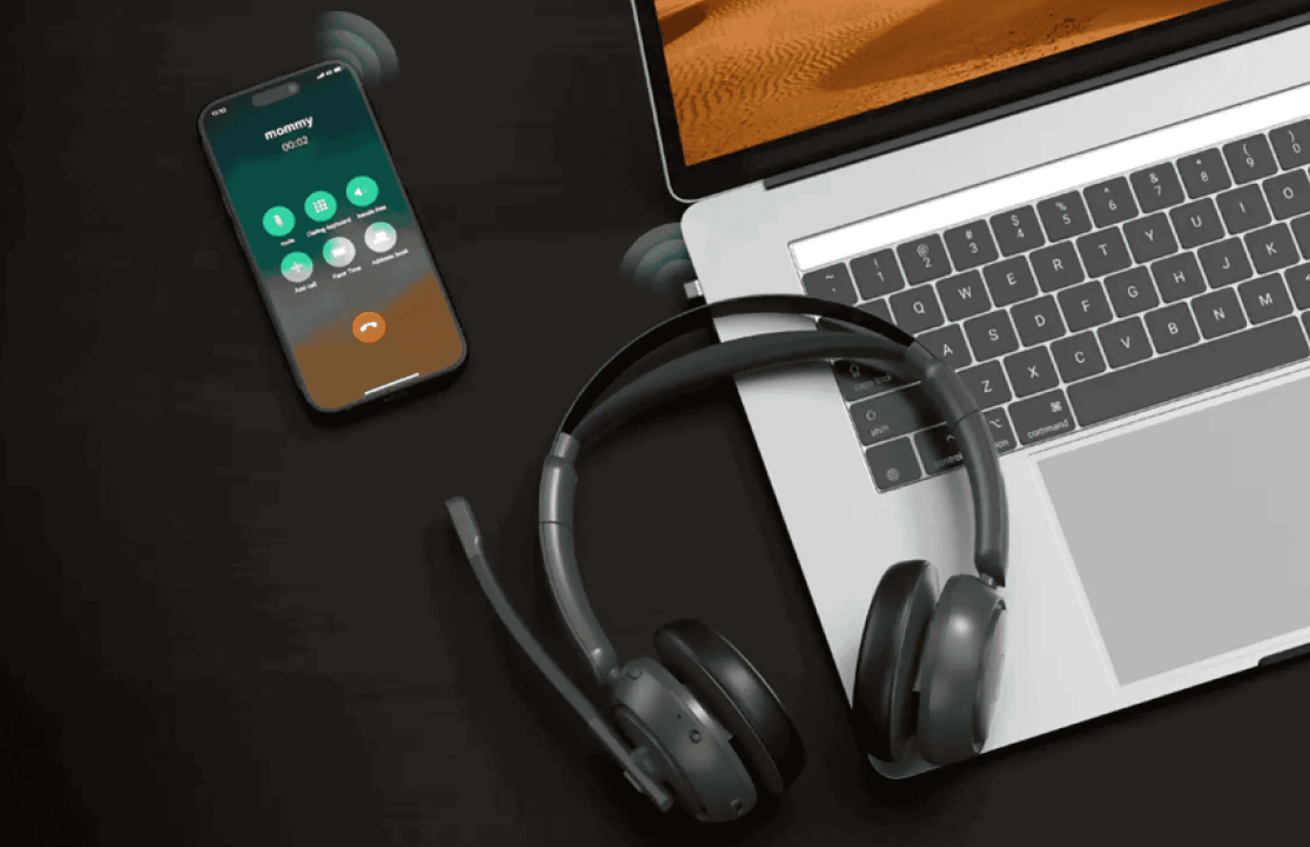 with dual-mic AI algorithm run on HiFi4 DSP, dongle for easy PC connection, 45H battery hour and charging stand.