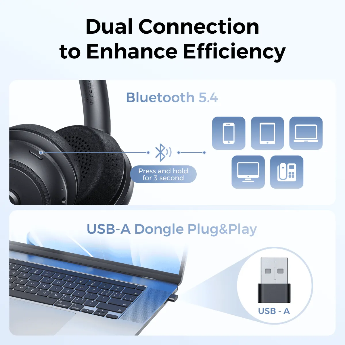 Bluetooth 5.4 for phones, USB-A dongle for PCs.