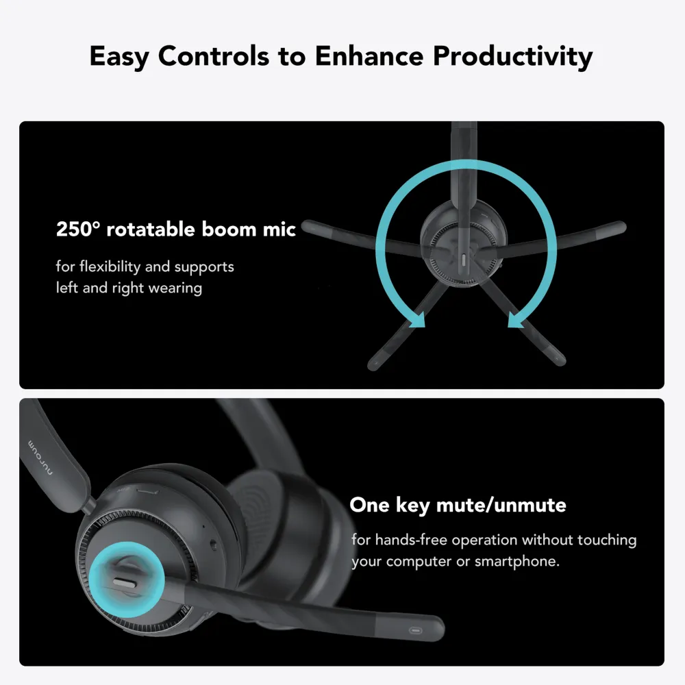 with dual-mic AI algorithm run on HiFi4 DSP, dongle for easy PC connection, 45H battery hour and charging stand.